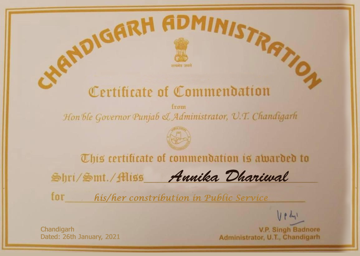 Public Service Award from Hon’ble Governor of Punjab and Administrator of Chandigarh