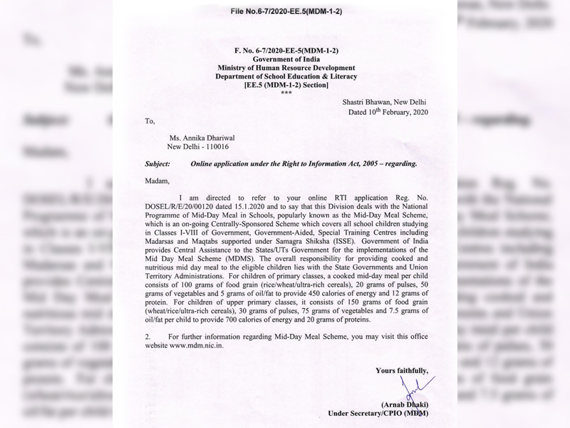 Filed right to information (RTI) to gather information and ensure proper allergen labelling for Mid- Day meals scheme.